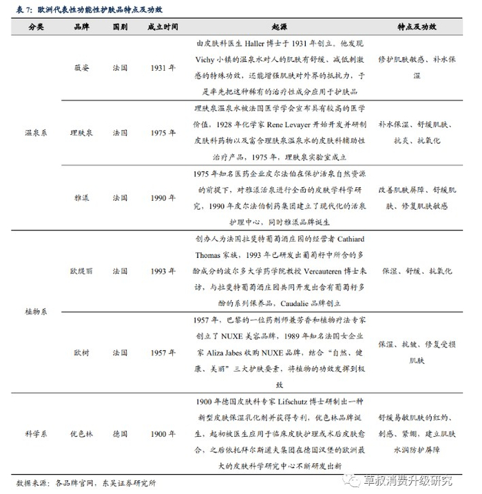 欧洲功能性护肤品主要为皮肤学级护肤品,法国品牌尤为突出。欧洲的功能性护肤品主要为皮肤学级护肤品,主要系资源丰富、发展较早及技术较为成熟,尤其法国品牌数量较多。具体来看,可大致分为三类:(1)温泉系:充分利用法国温泉小镇温泉水的疗养功效,发展出多个以富含丰富矿物质的温泉水为主要成分的品牌,代表品牌包括薇姿、理肤泉、雅漾;(2)植物系:主要研究植物提取物对皮肤的修复功效,代表品牌包括欧缇丽、欧树;(3)科学系:依托强大的科研实力研究成分配比,以应用于临床皮肤护理,代表品牌包括优色林。