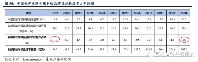 随着皮肤学级护肤品渗透率不断提升,其头部品牌在护肤品整体市占率亦有望提升,未来头部规模或可比肩护肤品超级品牌。我们假设2020-2030年头部皮肤学级护肤品在品类市占率保持在20.5%,则随着其在护肤品渗透率的提升,头部品牌在护肤品的市占率预计也将随之提升。参考上文对皮肤学级护肤品渗透率的预测,得出头部皮肤学级护肤品牌在护肤品的市占率至2030年预计可提升至4%以上,头部品牌的零售额预计可提升至200亿元以上。从护肤品整体市占率看,4%以上的市占率可比肩百雀羚、欧莱雅等超级品牌。
