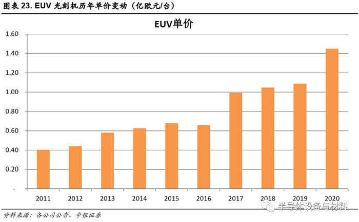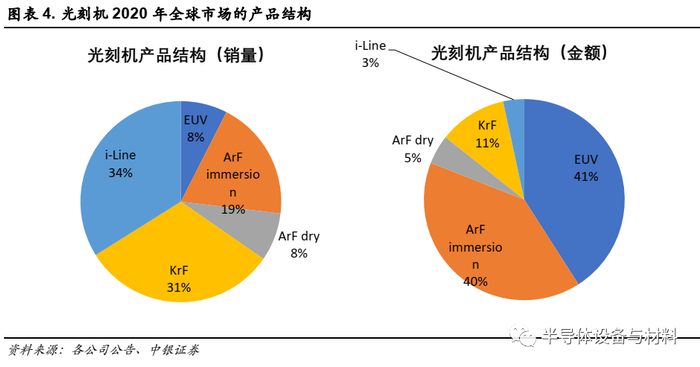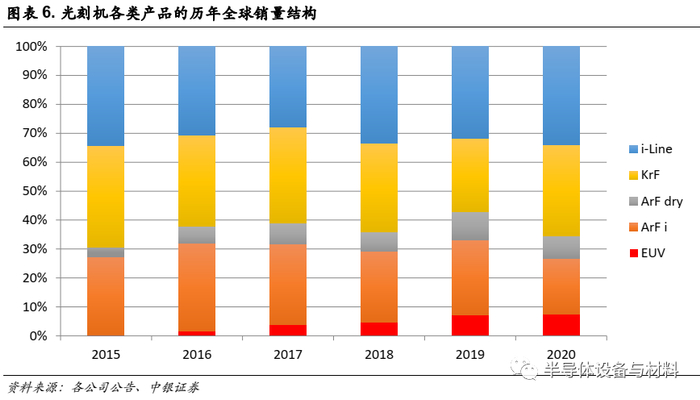 2、市场增量:光刻机行业市场规模的增量主要来自EUV,全球销量占比27%的EUV与ArF immersion占光刻机市场销售额的82%
