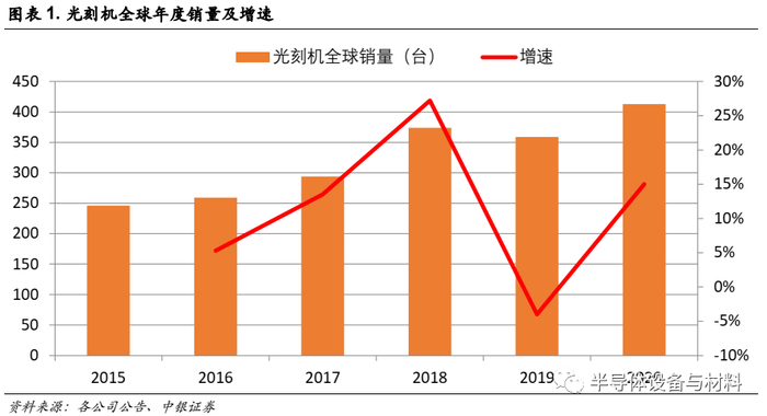 根据ASML、Canon、Nikon公告,全球光刻机销量413台,同比增长15%,按季度依次是95台、95台、97台、126台,分别同比增长19%、25%、8%、12%。