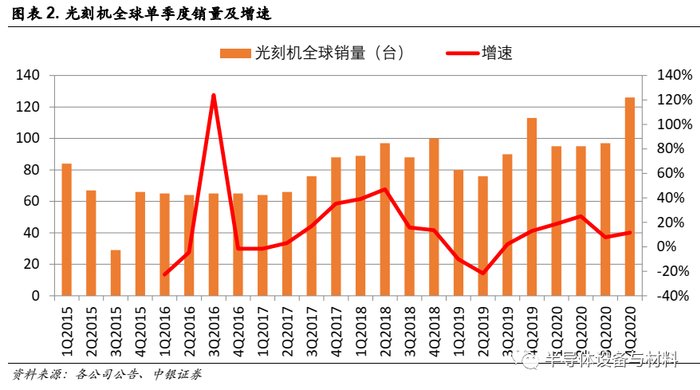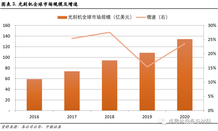 参考ASML单价,我们估计全球光刻机市场规模达到130多亿美元,同比增长20%以上,且2016-2020年全球光刻机市场规模年均复合增长23%。