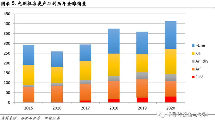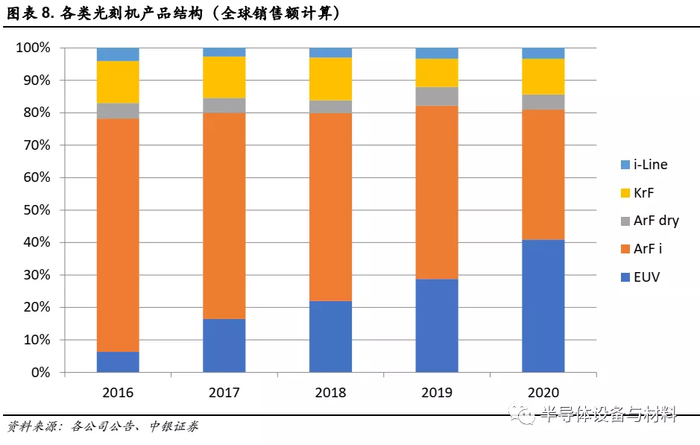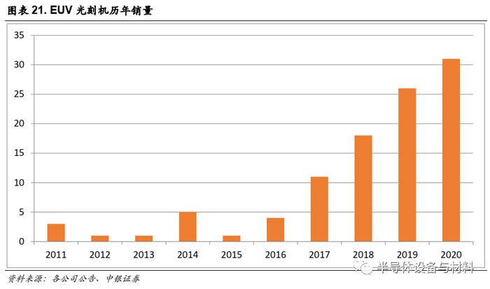 市场增量:光刻机行业市场规模的增量主要来自EUV,全球销量占比27%的EUV与ArF immersion占光刻机市场销售额的82%。2020年EUV光刻机销量31台占比8%,销售额55亿美元同比增长76%,占光刻机市场规模的比例为41%;ArF i销量80台占19%,销售额估计54亿美元同比下降7%,但占全球光刻机市场的40%。ArF dry、KrF、i-line光刻机销量分别为32台、130台、140台,分别同比增长3%、57%、25%,销量占比依次是8%、31%、34%,销售额占比依次是5%、11%、3%。