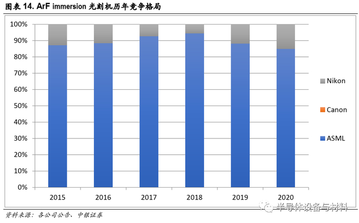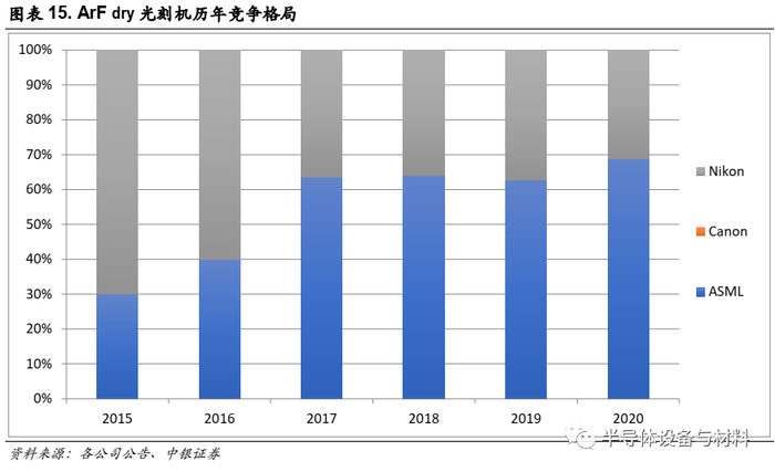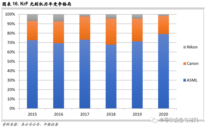 (4)KrF光刻机行业销量140台中,ASML占79%,Canon占19%,Nikon占2%;