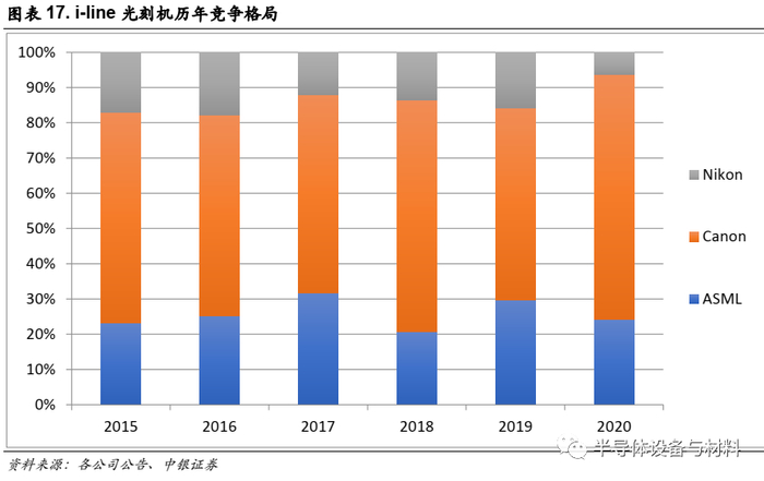 (5) i-line光刻机销量中,ASML占24%,Canon占69%,Nikon占6%。