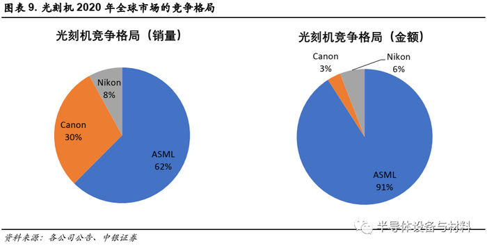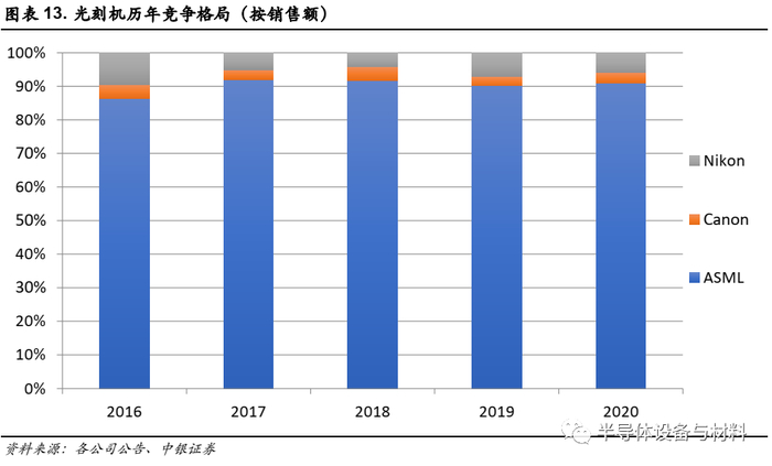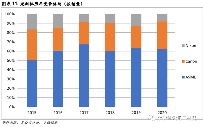 竞争格局:ASML垄断约90%光刻机市场。2020年413台光刻机中,ASML销售258台占比62%,Canon销售122台(KrF、i-line)占比30%,Nikon销售33台占比8%,按销售额计算,ASML、Canon、Nikon的光刻机销售额占比依次是91%、3%、6%。2020年,EUV目前仅有ASML制造供应;ArF immersion 80台销量中ASML销售了68台占85%,Nikon销售了12台占15%;ArF dry光刻机32销量中,ASML销售22台占69%,Nikon销售10台占比31%;KrF光刻机行业销量140台中,ASML占79%,Canon占19%,Nikon占2%,i-line光刻机销量中,ASML占24%,Canon占69%,Nikon占6%。