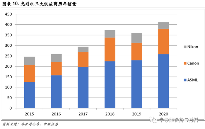 2020年413台光刻机中,ASML销售258台占比62%,Canon销售122台(KrF、i-line)占比30%,Nikon销售33台占比8%。按销售额计算,ASML、Canon、Nikon的光刻机销售额占比依次是91%、3%、6%。
