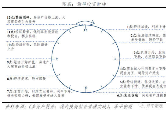 在最早的投资时钟里,大类资产包括现金、固定收益产品(债券)、股票、海外资产、大宗商品和房地产。经济周期在12个刻度的时钟上轮动,不同时刻对应着不同的经济阶段,其中12点代表经济最繁荣的阶段,而6点代表经济最萧条的阶段。