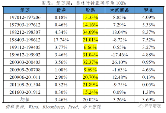 按照周期划分,校验美林时钟不同时期各类资产表现,可以得出,