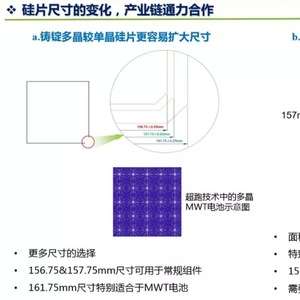 1、硅片环节:硅片尺寸大,意味着单晶硅棒尺寸大,而拉晶车间是按照单晶圆棒或方棒质量来计算产能的,这也就意味着同样的时间,生产出来的单晶硅棒质量更多,在设备、人员、辅材等不变的前提下提高了单晶生产产能,降低了生产成本;切片环节效率提升就更加明显了,同样一刀下去,硅片数量一样,面积的提高就是效率的提高,182硅片的面积是156硅片面积的1.36倍,这也就意味着在人工、设备不变的前提下产能提升了将近18%(0.36的一半),成本大大降低。