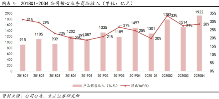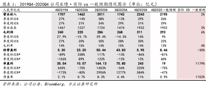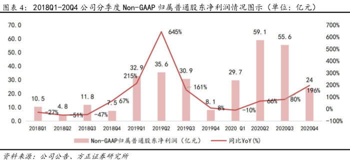 1.1 主要财务指标分析:20Q4公司实现营业收入2243亿元(YoY +31%,QoQ +29%),毛利润311亿元(YoY +30%, QoQ +16%),Non-GAAP 归母净利润为24亿元(YoY +196%),GAAP归属普通股东净利润为243亿元(YoY +584%,QoQ +220%)。