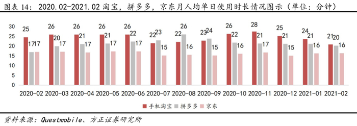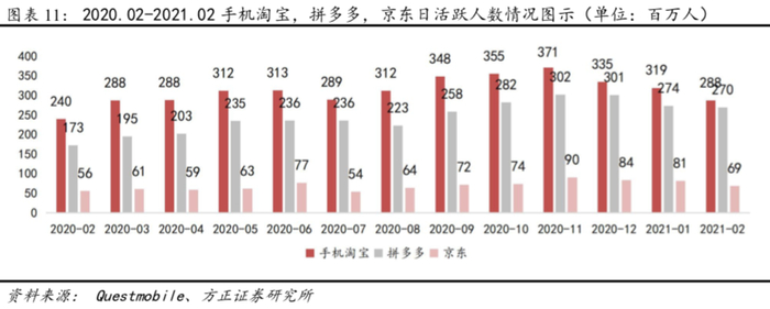 (2)APP月度平均活跃用户数:截至2021年2月,京东月度活跃用户数达3.1亿(YoY +18%),相比上一月下降4000万,相比去年增长超5000万。