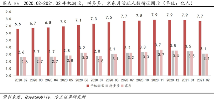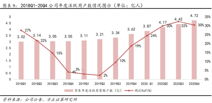 截至2021年2月,京东月度活跃用户数达3.1亿(YoY +18%),相比上一月下降4000万,相比去年增长超5000万。