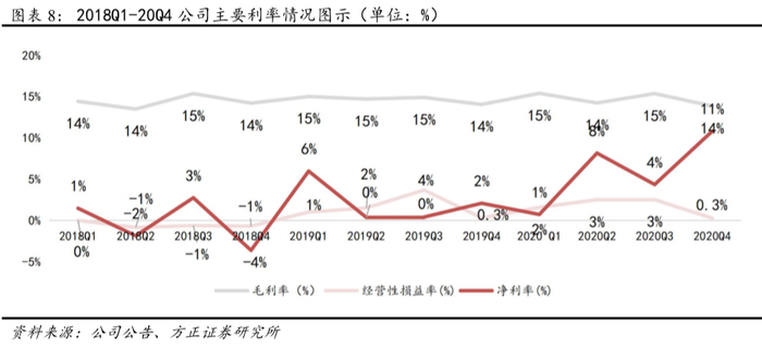 20Q4公司毛利率为14% (QoQ -1.0 pct,YoY +0 pct),经营性损益率为0.3%(QoQ -2.7 pct,YoY +0 pct),净利率为11%(QoQ +7 pct,YoY +9 pct)。