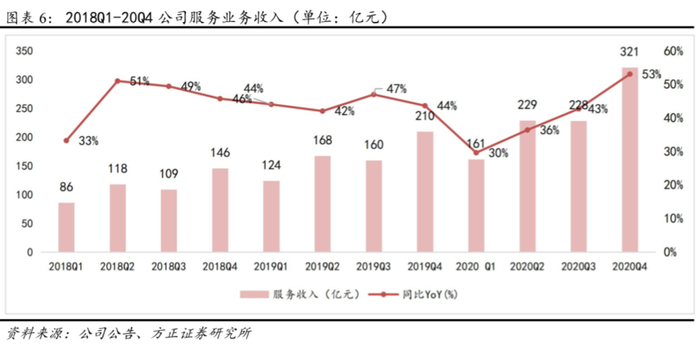 20Q4公司核心商品业务实现收入1922亿元(QoQ +27%, YoY +28%),其中电子产品及家电收入占60.24%。服务收入321亿元(QoQ +41%, YoY +53%),占整体收入的比例提升至14%,其中营销广告收入占54.4%。