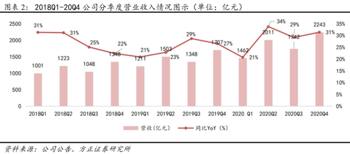 20Q4公司实现营业收入2243亿元(YoY +31%,QoQ +29%),毛利润311亿元(YoY +30%, QoQ +16%),Non-GAAP 归母净利润为24亿元(YoY +196%),GAAP归属普通股东净利润为243亿元(YoY +584%,QoQ +220%)。