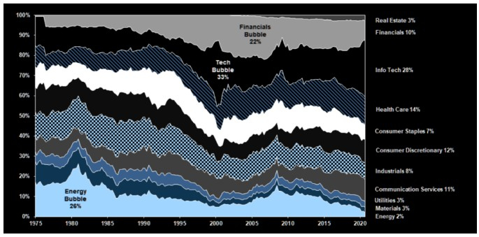 周末的时候,我做了一期社群分享,帮助大家回归了过去20年的美股周期性板块轮动。我们发现板块轮动是一个非常普遍的现象。2008年是银行和金融领涨大盘,2009年~2011年是大宗商品和能源领涨大盘,2012~2015年是生物科技领涨大盘;2015年~2019年是科技巨头领涨大盘,2020年则是二线成长股领涨大盘。