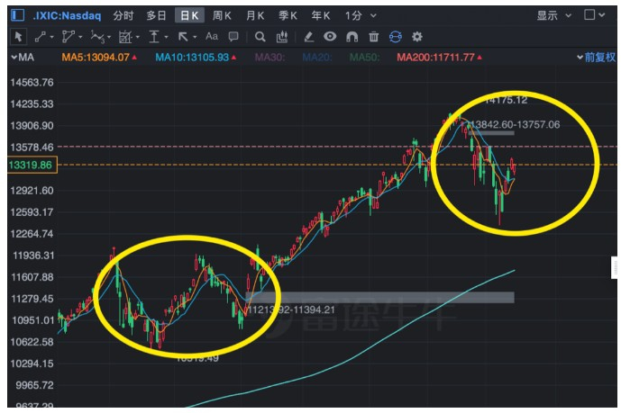 当前的市场其实大体上也是这样,纳指5天走出了5种不同的走势,周一暴跌,周二暴涨,周三横盘,周四暴涨,周五又微跌,没有任何规律可言,但整体却是震荡向上。