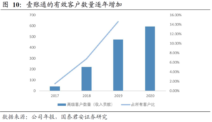壹账通将平安集团外的客户分为两类,第一类是年均带来收入超过10万人民币以上的“高级客户”,第二类是年收入贡献10万以下的“普通客户”。我们认为只有年收入超过10万的“高级客户”才是真正的有效客户,因为第二类“普通客户”基本对收入产生贡献较少。壹账通的有效客户数量增幅较快,说明通过行业资源叠加低价或免费“钩子”产品试用的获客方式取得显著成效。