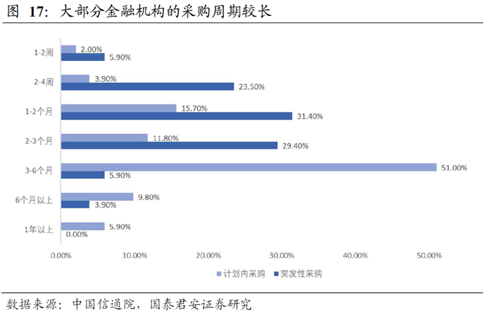 其次,中小金融机构普遍营收规模较小,科技投入的预算自然也相对较低。根据中国信通院的调研,超过五成金融机构的采购投入占比不超过6%,但往往这些金融机构无能力自建科技系统,所以只能对外采购。然而因为预算较少,所以在采购方面更为审慎,具体反映在采购流程周期较长,金额较高的采购一般要经过多轮开会研究和审批。
