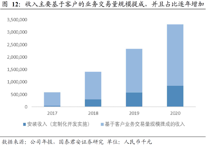 金融壹账通针对少部分重要性较高或者确定有后续合作机会的客户也会进行定制化的开发和改造,相关收入统计为“初装收入”里。这要是是出于后续更好输出自身标准化产品和解决方案,整体的收费模式上仍基于和客户实际业务交易量相挂钩的方式。