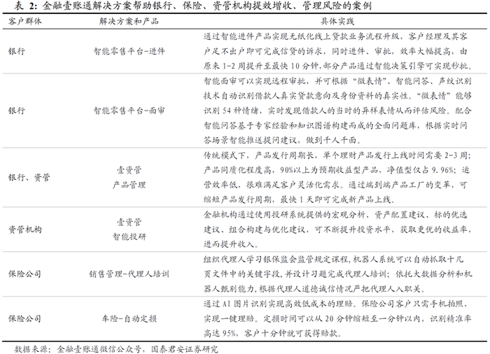 目前金融壹账通输出的产品已经有成熟的实践案例,主要通过业务流程的优化以及利用大数据分析等方法取得实效。