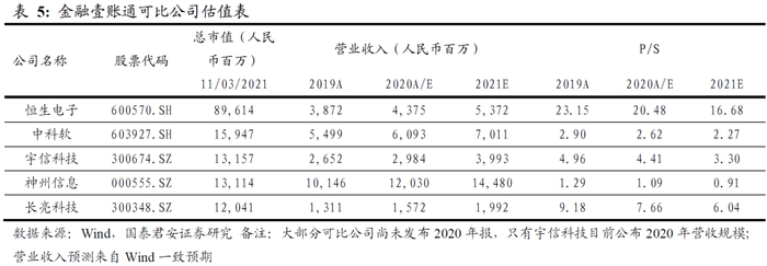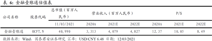 因为金融壹账通尚未实现盈利,参考其他科技公司的初创期的估值方法,我们对其采用市销率相对估值法。