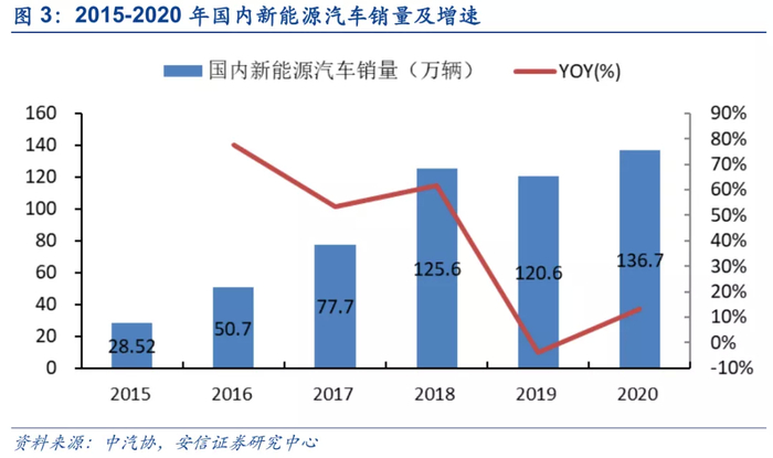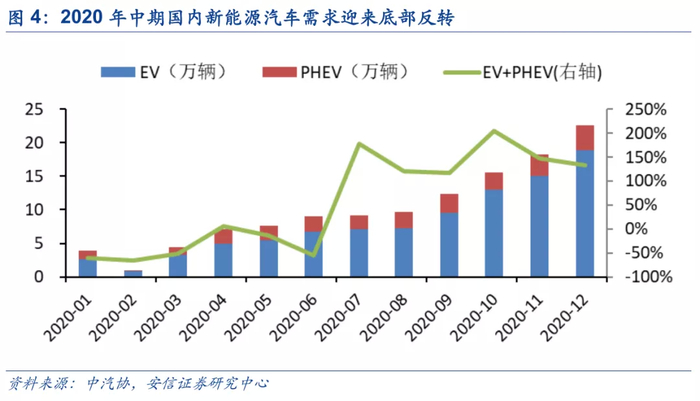 2020年中期国内疫情好转下新能源汽车需求重回增长轨道。2020年上半年新冠疫情封锁导致新能源汽车产销被强力压制,但下半年随着疫情影响减弱及高质量供给的推出,新能源汽车需求重回增长轨道。从数据上看,新能源汽车每月销量从9.2万辆增长至十二月22.6万辆的历史高点,且自七月以来持续大幅高于2019年同期。
