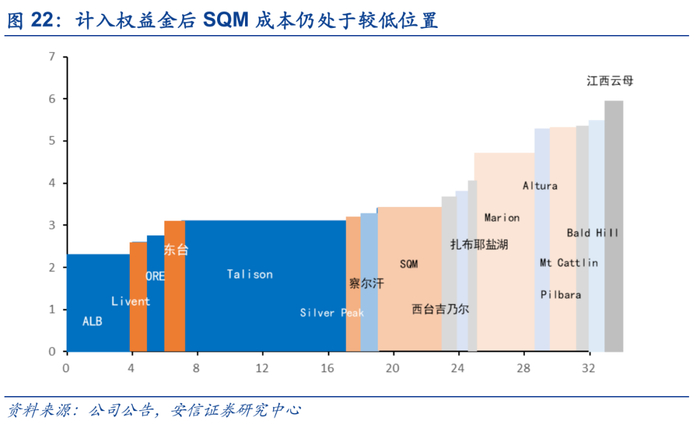 参股SQM布局全球最优质盐湖资源,分享SQM量价齐升红利。当前天齐锂业持有SQM25.87%的股份,SQM扩产规划积极,根据公司公告,SQM计划2021年底将Atacama盐湖产能扩张到12万吨LCE,23年达到18万吨LCE。当前SQM在Atacama盐湖的提锂的旧配额已经用完,新配额将采用阶梯定价的方式,但即使计入权益金影响SQM盐湖提锂成本水平仍处于相对较低位置。