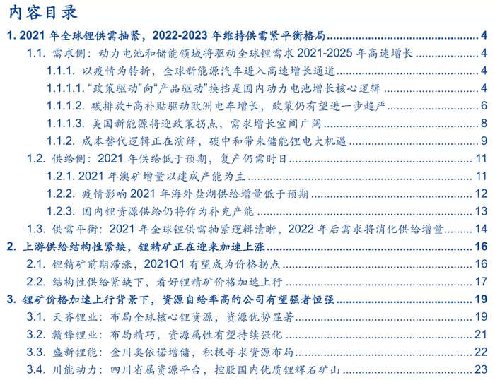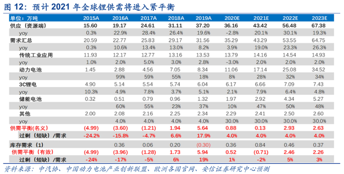 1.2021年全球锂供需抽紧,2022-2023年维持供需紧平衡格局