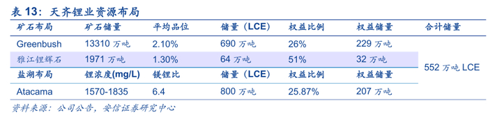 雅江措拉项目将作为天齐国内战略资源储备。天齐通过子公司天齐盛合锂业控制四川雅江措拉项目开采权。资源方面,雅江措拉锂矿资源量达1971万吨,平均氧化锂品位1.30%,伴生氧化铍及氧化铌。产能方面,雅江措拉一期规划60万吨/年的采选产能,13年短暂建设后暂缓,当前作为天齐国内储备资源仍无开发计划。