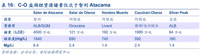 盐湖端C-O盐湖资源禀赋仅次于Atacama,其投产将是赣锋资源进化的重要一步。资源禀赋方面,C-O盐湖储量仅次于Atacama,且阿根廷盐湖不受智利的提锂额度制约,扩张潜力极大。成本方面,根据可研其碳酸锂运营成本为3579美金/吨,这一成本水平已经接近Atacama提锂成本,且阿根廷盐湖提锂权益金相对更低。根据可研报告,C-O盐湖原计划2021年投产,但受疫情影响或将有所延迟,投产后将极大增强赣锋资源属性。