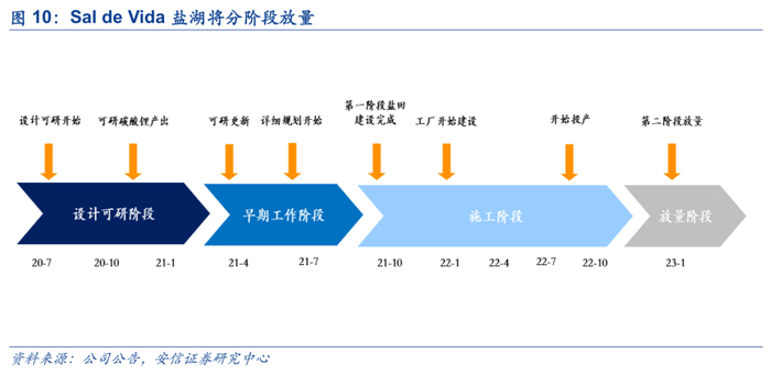 海外盐湖供给增量将在2022年后逐渐释放。根据公司指引,海外盐湖扩产产能将在2022年开始逐渐投入市场,南美盐湖供给的释放将呈现两大特点,一是不确定性相对较强,受疫情影响南美盐湖实际投产时间仍可能晚于预期,且新投产盐湖在提锂工艺上仍将面临挑战。二是新产能将分阶段逐步释放,盐湖产能达产所需时间一般要慢于硬岩锂矿且资本开支相对较高,如新投产盐湖Sal de vida将分阶段在两年内逐步达产。