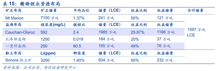 赣锋资源布局以绿地项目为主,后续资源属性有望持续强化。矿石端当前赣锋的资源供给以Mt Marion为主,Pilbara及Altura为辅,其锂精矿成本虽难以匹敌格林布什但仍位于澳矿中游,可提供稳定资源保障。盐湖端当前赣锋的潜力资源主要在阿根廷的Cauchari-Olaroz盐湖,其储量仅次于Atacama,另外赣锋墨西哥Sonora黏土矿也极具潜力,计入伴生金属成本可能低于矿石提锂。