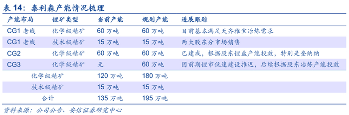 泰利森以供给两大股东为主,富余产能蓄势待发。泰利森当前具有锂精矿产能135万吨(120万吨化学级、15万吨技术级),根据股东协议,其中化学级按协议不能外售,仅供给两大股东冶炼产能,技术级由两大股东划分市场销售。当前二期60万吨化学级锂精矿产能已经完工,但两大股东配套锂盐产能尚未建成,将配合两大股东锂盐产能放量。未来泰利森产能仍有继续拓展空间,其远期规划建设三期锂精矿产能,投产后总产能将达到195万吨。