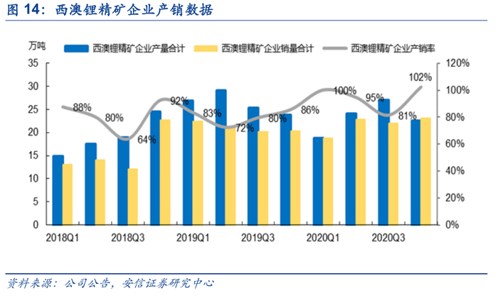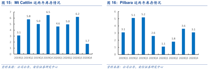 下游景气度提升驱动主流澳矿库存加速去化。产销率方面,我们统计了除泰利森外主要在产澳矿2020Q4产销率,整体从Q3的81%大幅提升102%,去库趋势明显。库存数据方面,从两家已披露锂精矿库存的矿企看,银河资源Q4锂精矿库存约1.70万吨,环比下降72.6%,pilbara锂精矿库存3.09万吨,环比下降-14.9%,库存水平已经处于历史低位。