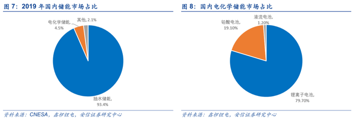 电化学储能发展空间广阔。当前国内储能市场大规模商业化的储能技术主要有抽水储能和电化学储能两种路径,根据鑫椤锂电数据,2019年中国中国已投运储能项目累计装机规模180Gwh,其中抽水储能占比93.4%,仍为主要技术路线。电化学储能占比约4.5%,电化学储能主要以铅酸电池和磷酸铁锂电池为代表,相对抽水储能具有储能效率更高、配置灵活的优势,但当前成本经济性相对不足。
