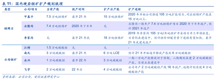 国内锂矿近年扩产相对积极,但仍将作为全球锂资源补充供给。国内锂矿对资源安全保障具有重要战略意义,近年虽经历锂价低谷但扩产相对积极。锂辉石方面,一是甲基卡扩产项目完工后其采选产能将扩张至105万吨/年,对应锂精矿15万吨以上,有望在21年投产。二是业隆沟一期7.4万吨/年锂精矿产能在2020年下半年投产,21年或将达产。锂云母方面江特、南氏、永兴及飞宇皆有扩产计划,但云母提锂从投产到达产仍存在一定不确定性。