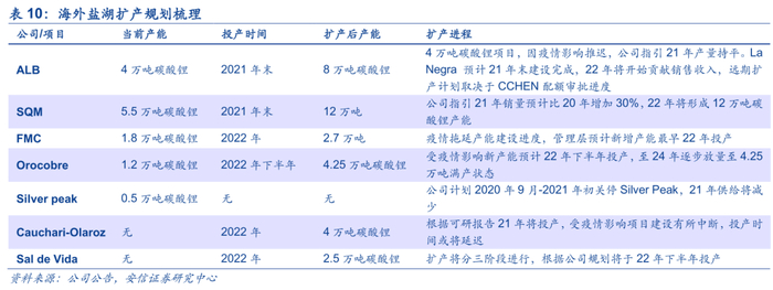 受疫情拖累南美盐湖扩产进度不及预期。海外主要盐湖原扩产计划主要对应2021年投入市场以匹配需求增长,但2020年南美疫情严重影响盐湖扩产建设进度,一是雅宝、SQM、FMC、Orocobre等在产盐湖的扩产项目受疫情影响皆有所延后,二是C-O盐湖及Sal de Vida等新增盐湖产能受到疫情影响建设进度也慢于预期。