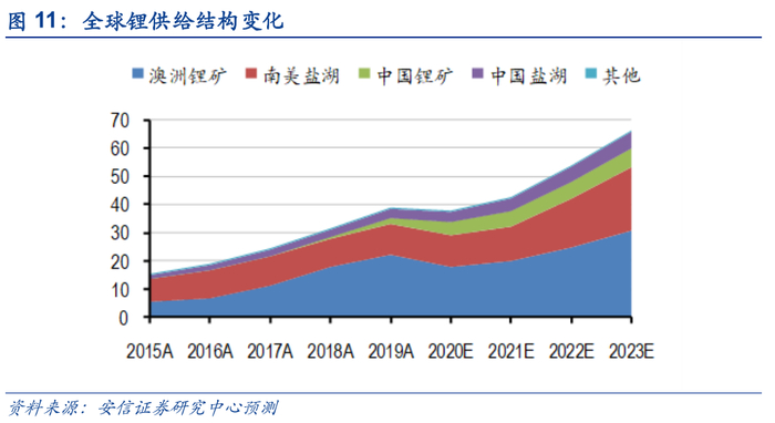 从供给结构看,澳矿和南美盐湖仍将作为供给增量主力,预计2021年澳洲锂矿、南美盐湖、中国锂矿、中国盐湖分别占比48%、32%、11%、9%,2021-2023年锂资源端供给分别为43.4万吨LCE、56.5万吨LCE、67.4万吨LCE,CAGR为25%。