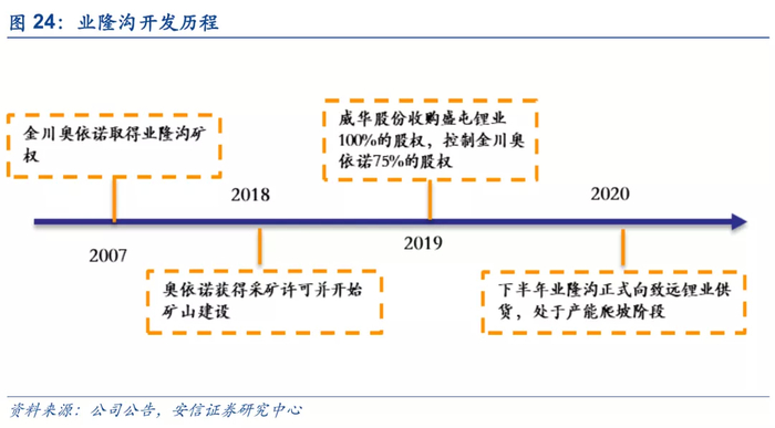 业隆沟资源储量相对较小,但仍有增储潜力。盛新锂能于19年收购盛屯矿业100%的股权,通过金川奥依诺间接控制业隆沟采矿权。业隆沟资源储量相对较小,2020年10月盛新锂能发布公告宣布业隆沟储量从654万增加到865万,平均品位1.29%,折合氧化锂约11.2万吨,且仍有增储潜力。业隆沟一期产能(7.4万吨锂精矿)已经于2020年下半年投产,后续将持续为盛新提供资源供给。