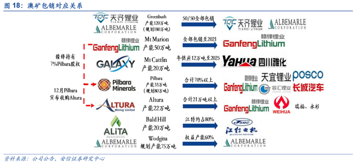 矿石端以Mt Marion为主,三大矿山合力保障供给。赣锋当前持有Mt Marion矿山50%的股份,并全部包销其45万吨锂精矿产能,Mt Marion近期无扩产计划但预计将满产保障赣锋资源供给。赣锋参股Pilbara项目6.86%的股份且包销一期每年16万吨锂精矿并参与定增锁定二期15万吨锂精矿。根据赣锋公告,赣锋虽没有持股Altura,但签订了每年7万吨的包销协议,合计锁定了约83万吨锂精矿产能。