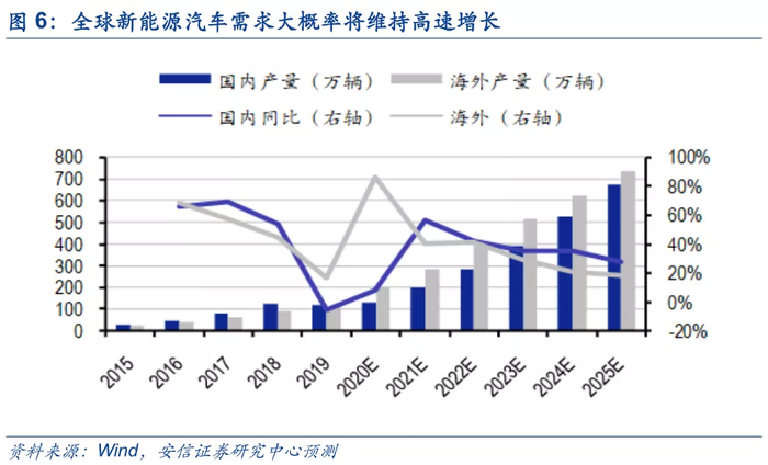 ■全球新能源汽车需求大潮势不可挡。国内方面,“政策驱动”向“产品驱动”换挡是国内电动车的核心增长逻辑,随着爆款车型和新技术不断推出,电动车已表现出相对传统汽车的强劲竞争力。海外方面,“碳排放罚款+高补贴”驱动欧洲新能源汽车增长,未来碳排放罚款仍有望趋严;美国在政策转向后新能源汽车需求有望超出预期。我们预计2021-2025年全球新能源汽车销量分别为469万辆、669万辆、894万辆、1161万辆、1449万辆,CAGR为33%,对应全球锂需求量分别为17.1万吨、25.1万吨、34.5万吨、45.5万吨、56.9万吨,CAGR高达35%。