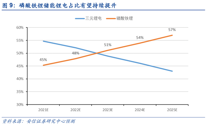 储能领域磷酸铁锂电池相对三元路径更优。根据鑫椤锂电数据,目前三元型电芯相比磷酸铁锂型电芯要贵0.12-0.15元/Wh,其主要优点在能量密度更高,而在能量密度要求较低的储能领域磷酸铁锂路径在成本及安全性等方面更具优势。从当前市场格局看,国内储能锂电以磷酸铁锂电池为主,海外以三元电池为主,磷酸铁锂电池在储能锂电市场占比有望持续提升,预计2021-2025年磷酸铁锂电池占比分别为45%、48%、51%、54%、57%,三元电池占比分别为55%、52%、49%、46%、43%。