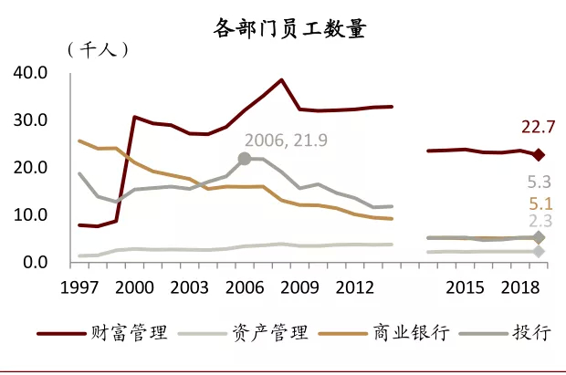 资料来源:公司公告,中金公司研究 注:2015年集团调整了员工人数在公司中心和业务部门之间的划分方法,公司中心“服务”与“资产负债管理”两个部门的员工不再划分到业务部门,因此业务部门员工人数2015年(数据重述到2013年)开始普遍减少