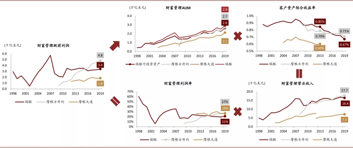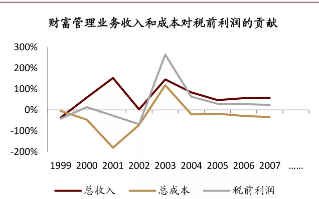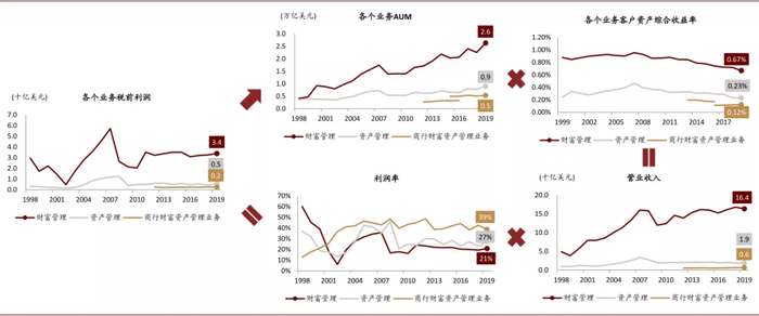财富管理业务盈利主要驱动因素为AUM、资产收益率和利润率,其税前利润=客户资产规模×资产收益率×利润率,财富管理部门税前利润高可以归因为快速增长的AUM和高费率,利润率并不高,即成本投入处于高位。