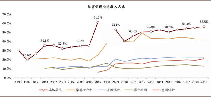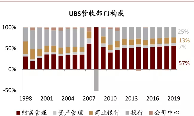 图表: 瑞银集团财富管理收入占比远高于可比行,2019年达到57%