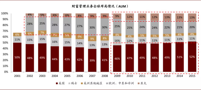 业务布局覆盖财富规模较大和高增长的区域,金融危机前欧洲、美国是重点市场,2008年后亚洲的战略地位迅速上升。