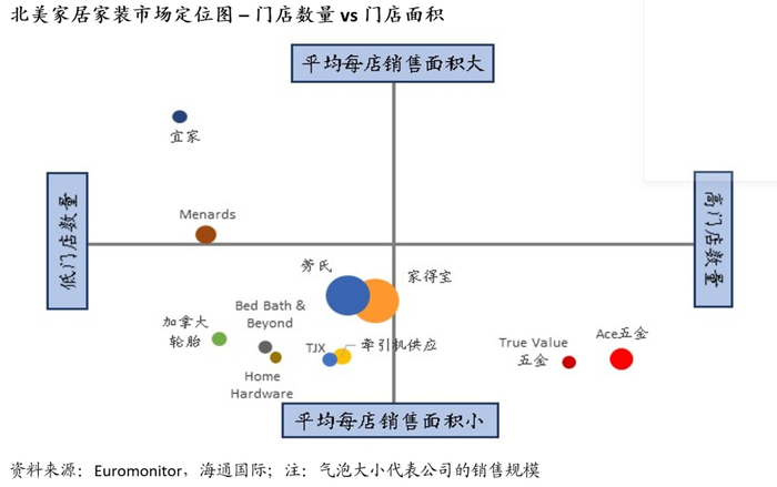 以“超级大卖场”为店铺经营模式的仅有三家,但却持有了约三分之一的市场,其完整、多样的产品线能够满足广泛客户群的需求;龙头在北美地区门店数目多,有超过2000家连锁店,门店坪效也高于比平均。