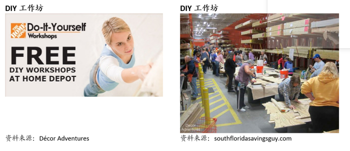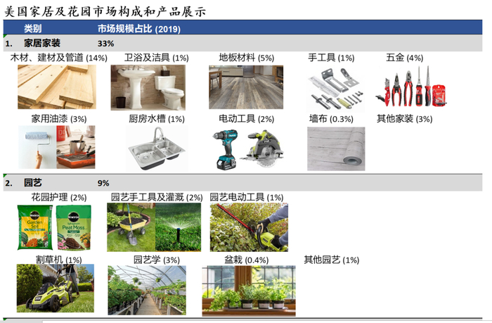 家居装饰的产品种类繁多,一个大卖场就能展示3-4万款产品,线上更高达两百万款,大致可以分为3大种类:(1)家具家装(33%占比)–房屋装修、保养和维修所需的物料和工具;(2)园艺(9%占比)–保养护理草坪和花园所需的物料和工具,(3)家居用品、家具和家电(57%占比)– 装修前后客户都会有买室内与户外家具的需求,以便搭配整体设计风格,装修完毕后就会购买家居用品和家电。