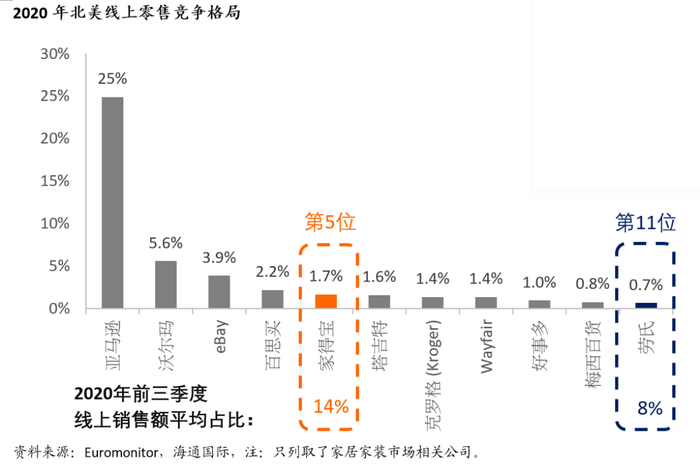 家装商反攻电商渠道,提升市场份额。就专业家装商而言,我们预计未来其中一个提升市场份额的手段就是通过电商渠道,这些零售商能利用其庞大便利的销售网点为网上购物的客户提供最快当天商店取货服务,一般在下单的几个小时之内,客户就可以在服务台、储物柜或不用下车的路边取货,家得宝的线上收入里就有60%来自于商店取货,其余40%则是送货上门,包括免费送货和最快当天到达的快递服务;家得宝和劳氏近年一直加大投资在电商渠道的基础建设,成功在去年疫情期间突围而出,大幅提高市场份额。